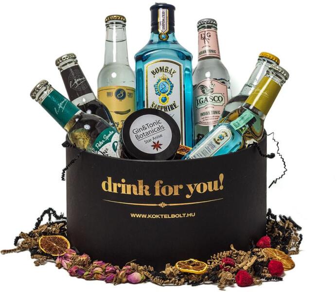 Drink For You feliratos Bombay Gin Tonik Ajándék csomag fekete díszdobozban - ginshop